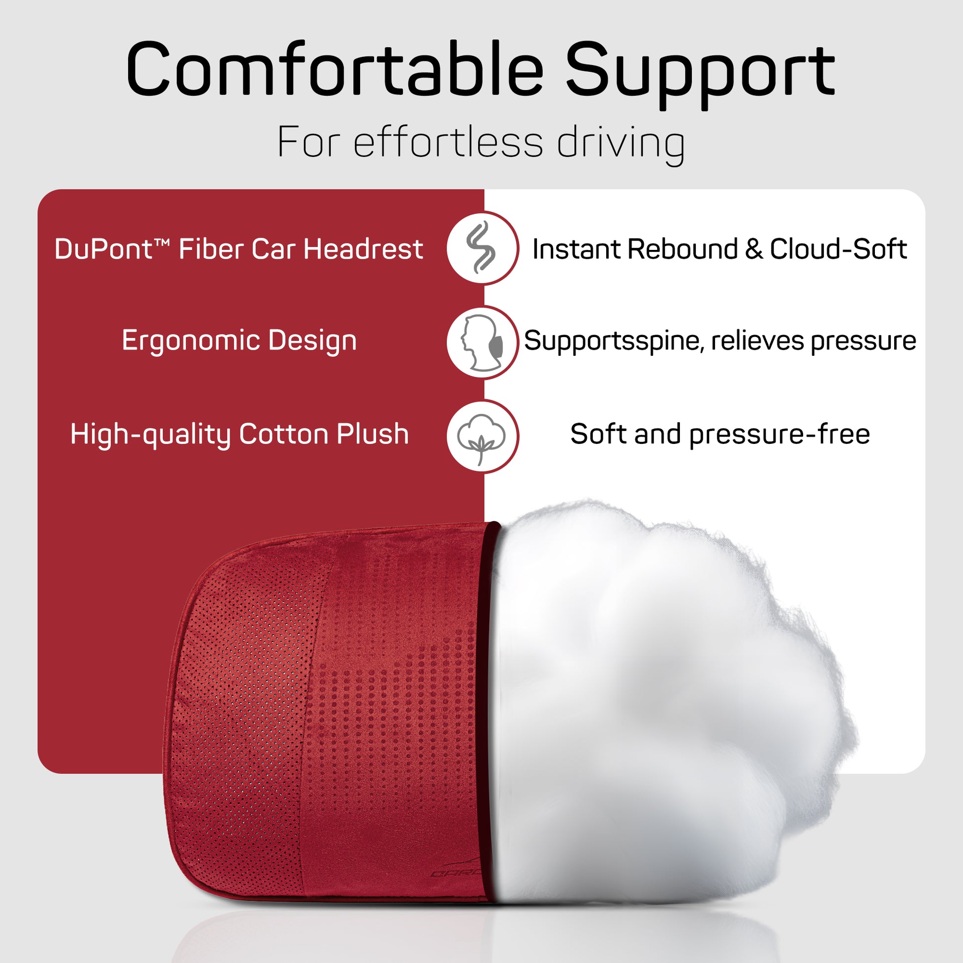 The ultra-soft, temperature-regulating design cradles your neck in luxurious support, transforming every journey into pure relaxation. DuPont Fiber Car Headrest ensures instant rebound and cloud-soft support. Say goodbye to neck strain with our Car Neck Pillow & Headrest—designed for long drives and daily commutes.